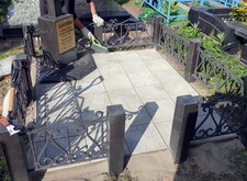 Первым делом мы взялись за установку саркофага: изготовив предварительно саркофаг, размещаем его на могиле под уровнем плитки. Предварительно территория места захоронения была полностью очищена от сорняка и прочего мусора.